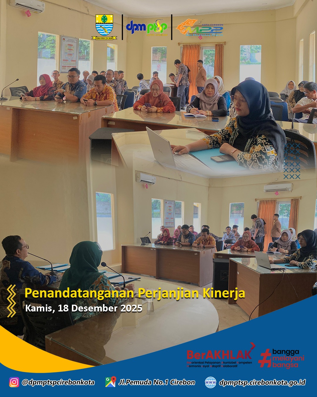 Hallo Sobat OSS,! 🇮🇩🇮🇩🇮🇩 pada hari Kamis, tanggal 18 Desember 2025 telah dilaksanakan penandatanganan Perjanjian Kinerja perubahan 2025 Dinas Penanaman Modal dan Pelayanan Terpadu Satu Pintu Kota Cirebon. Penandatanganan Perjanjian Kinerja sebagai wujud komitmen bersama dalam meningkatkan akuntabilitas, transparansi, dan kualitas kinerja organisasi. Melalui perjanjian ini, setiap target dan tanggung jawab ditetapkan secara jelas untuk mendukung pencapaian tujuan strategis dan pelayanan yang lebih optimal.